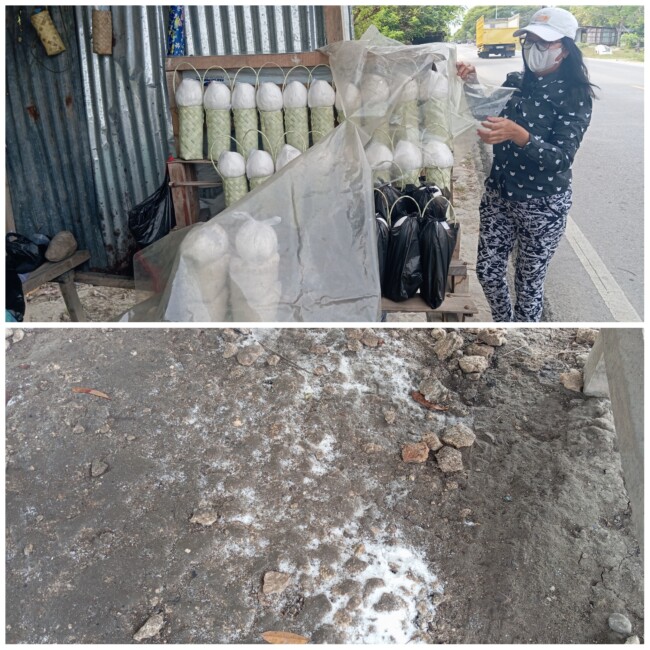 “Pas pagi saat mau buka jualan, saya terkejut plastik sudah robek, garam semua tumpah ke tanah, ini sudah ketiga kali terjadi”, ujarnya dengan penuh haru.
